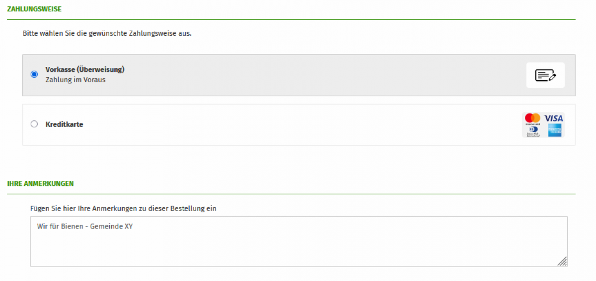 Hinweis: falls Sie Versand auswählen, müssen Sie die Lieferkosten zahlen, diese werden nicht von der "Wir für Bienen"-Aktion abgedeckt. - Im zweiten Schritt im Feld Zahlungsweise: „Vorkasse (Überweisung)“ auswählen. (siehe Screenshot)