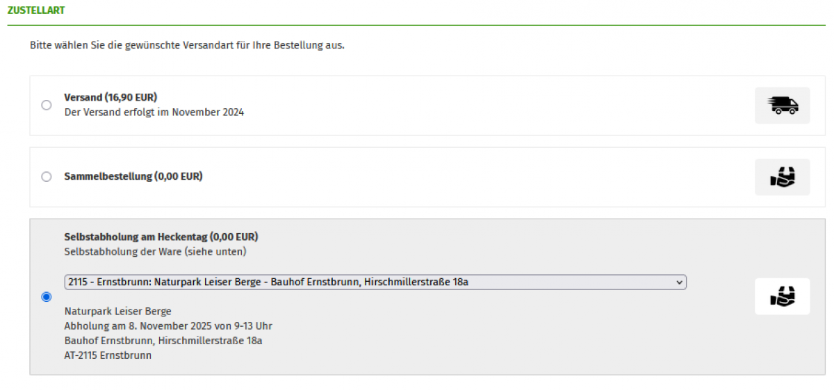 - Nach Klick auf „Kasse“ im Warenkorb im ersten Schritt entweder „Versand" oder „Selbstabholung am Heckentag“ und die gewünschte Abholstation, auswählen. (siehe Screenshot)